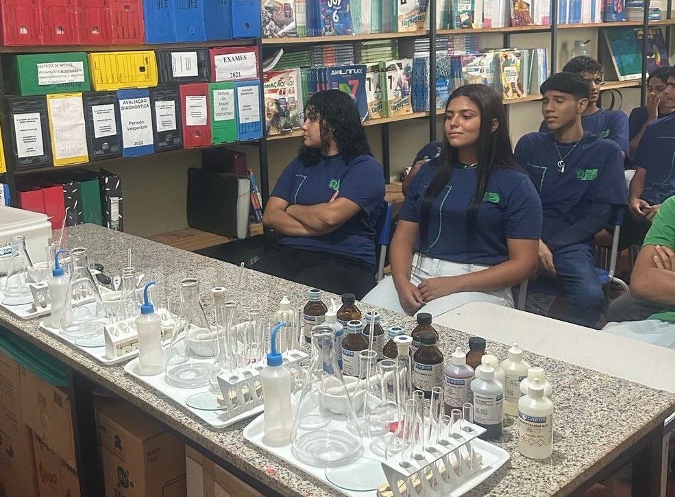 Alunos do 2º C vivenciam uma experiência prática com equipamentos laboratoriais em aula conduzida pelo professor Haroldo