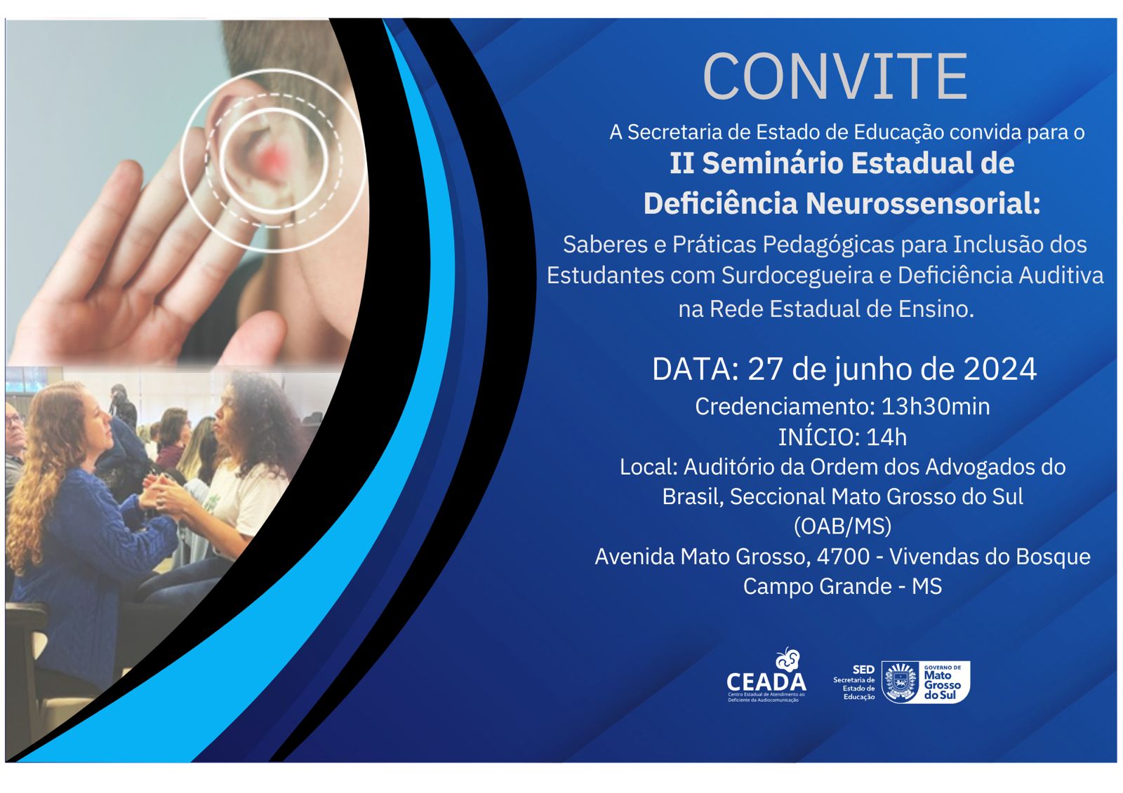 A temática será sobre “Saberes e Práticas Pedagógicas para Inclusão dos Estudantes com Surdocegueira e Deficiência Auditiva na Rede Estadual de Ensino". Inscrições pelo link https://doity.com.br/ll-se