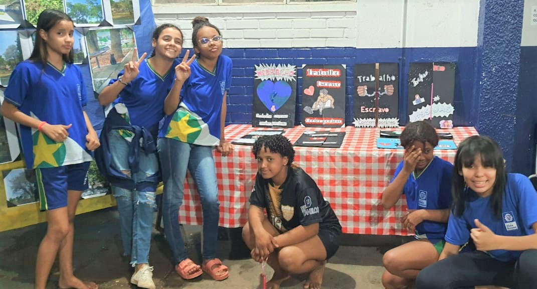 Nessas atividades, estudantes da Escola Estadual Antonio Epaminondas, no Bairro Baú, produziram cartazes e banners contra o trabalho análogo à escravidão