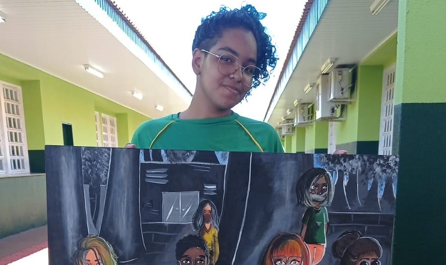 A partir do quadro “Operários” de Tarsila do Amaral, a estudante representou, em sua arte, os rostos das famílias na pandemia, retratando suas diversidades, preocupações e esperanças.