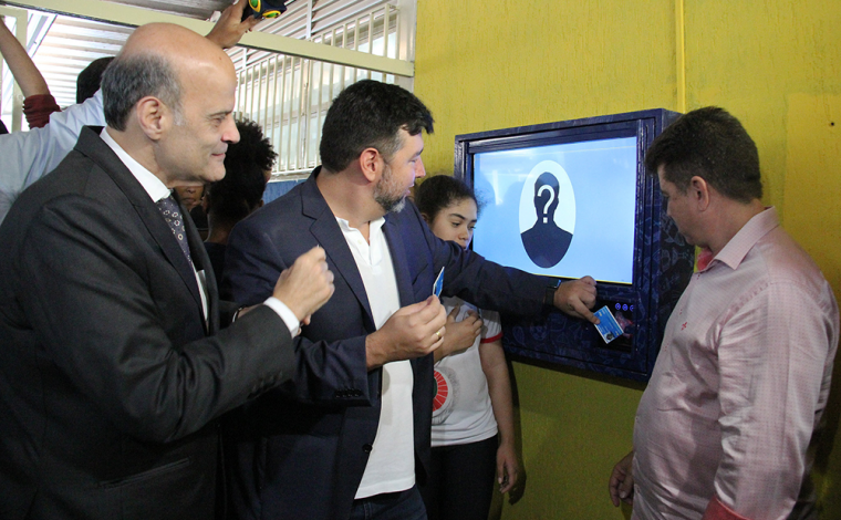 Governador em exercício, Paco Britto, e secretário de Educação do DF, Rafael Parente, mostram o novo sistema de controle de acesso às escolas, com carteirinha estudantil informatizada