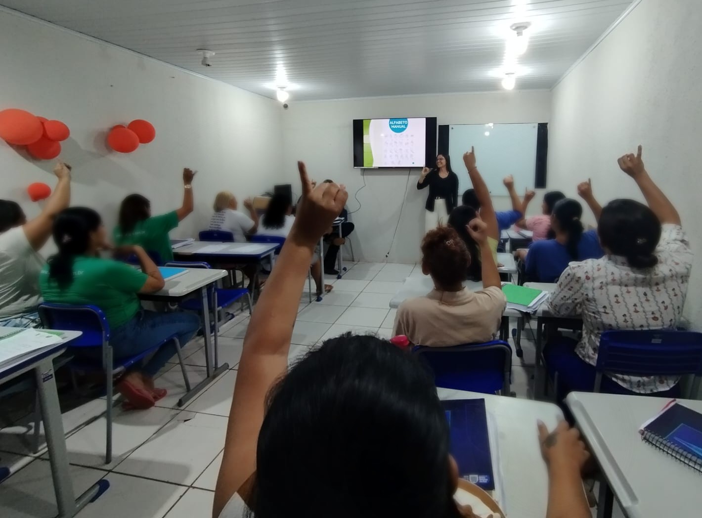 A atividade apresentou noções básicas de Libras (Língua Brasileira de Sinais), ressaltando a importância da comunicação acessível no ambiente de trabalho e no acolhimento de pessoas surdas.