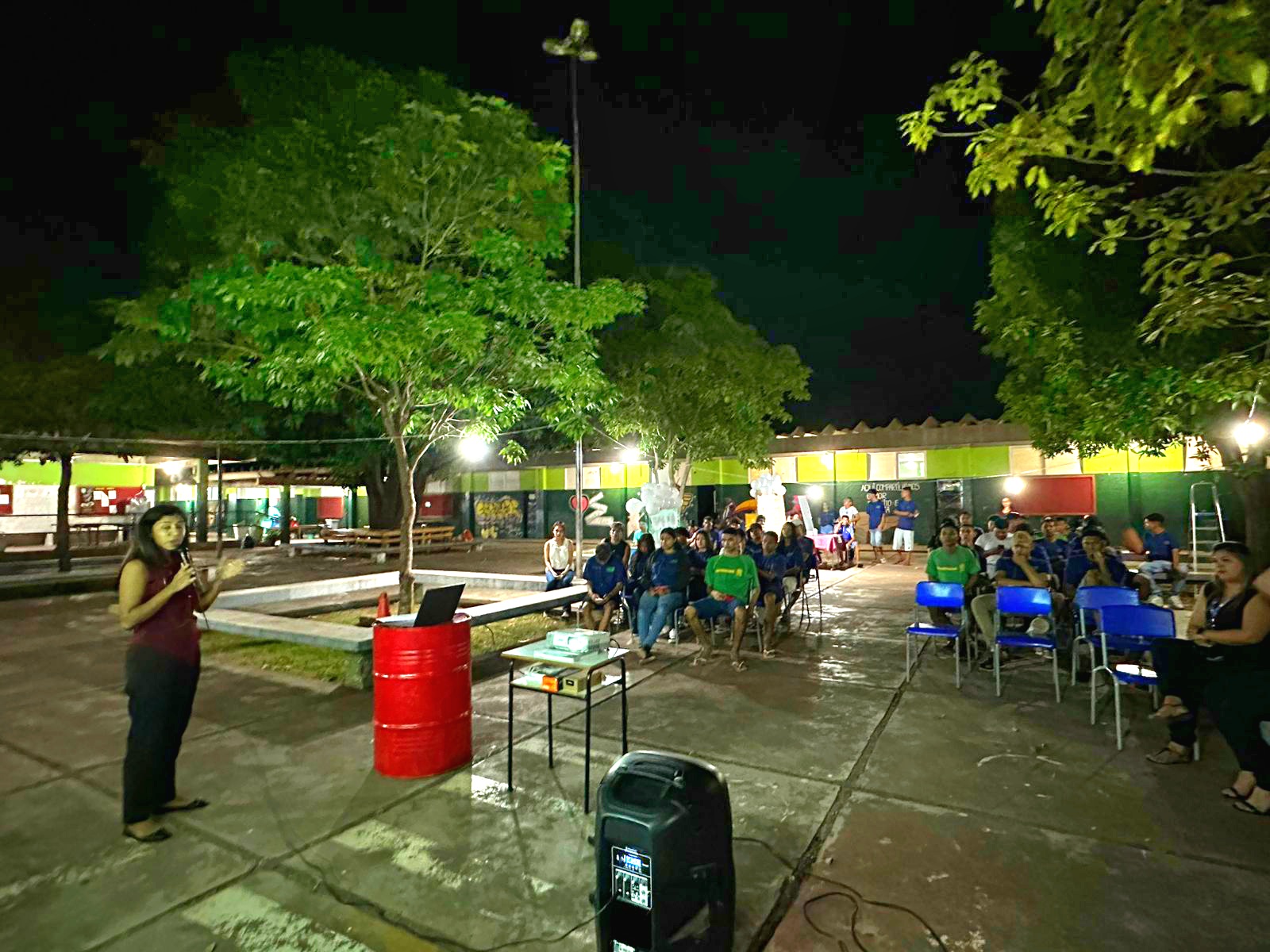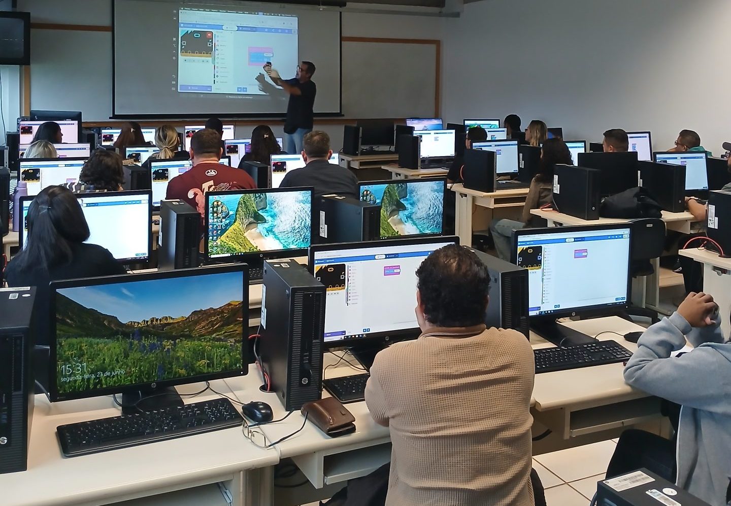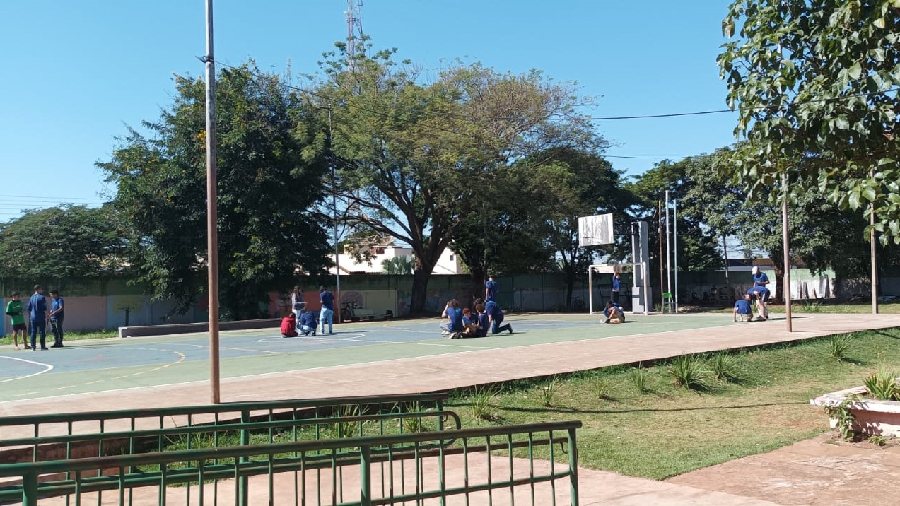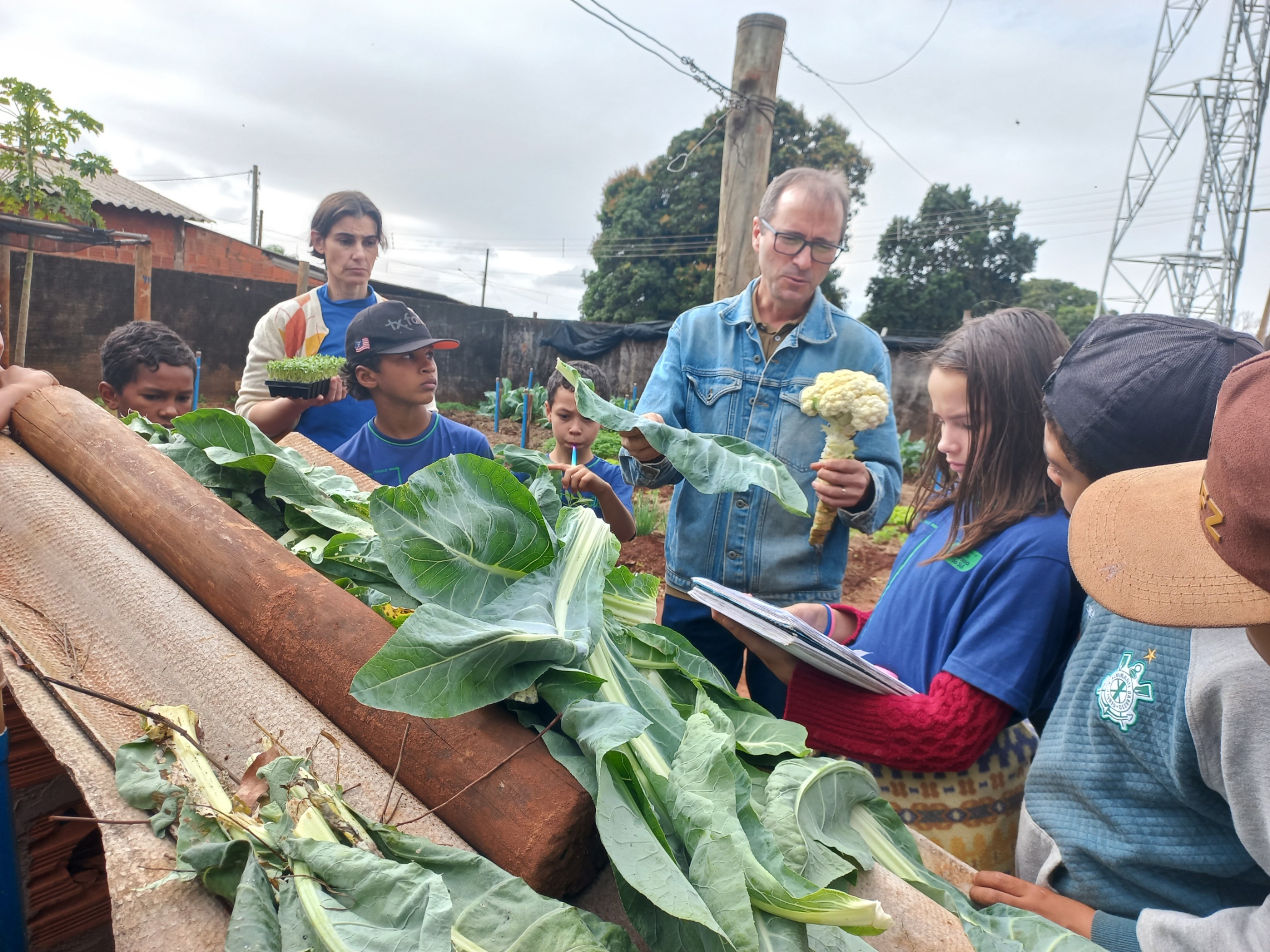 A atividade teve início com uma aula prática na horta da escola, onde os alunos observaram as 12 culturas já implantadas, como alface, cebolinha, couve, rúcula, repolho, entre outras.