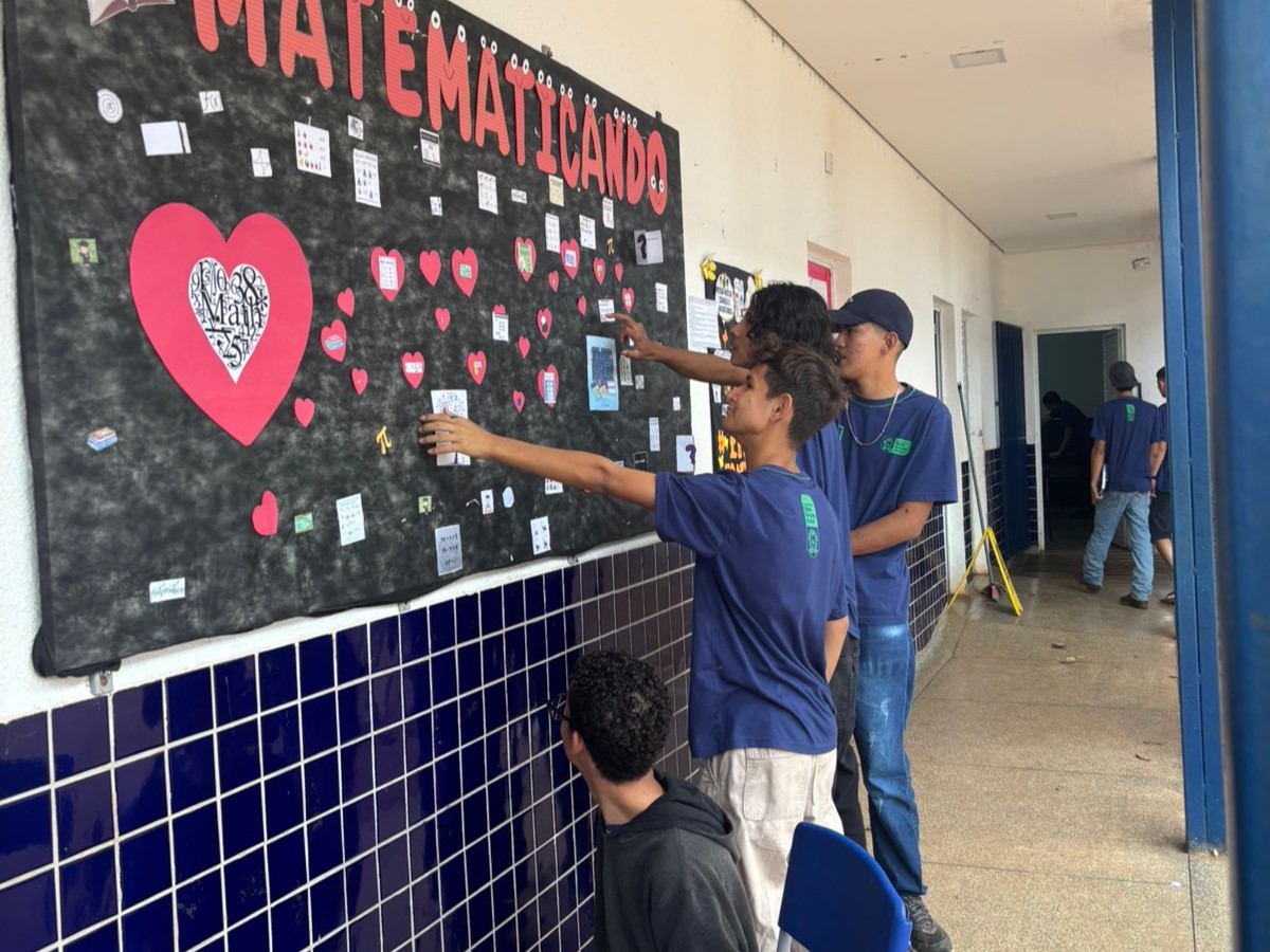 O mural apresenta expressões matemáticas, enigmas, charadas, quebra-cabeças e desafios de lógica que desafiam os estudantes a refletir, resolver problemas e explorar diferentes formas de raciocínio.