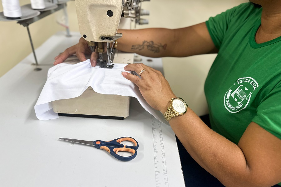 Iniciativa ‘Elas Costurando Vidas, Sonhos e Esperança’ capacita mães dos estudantes em corte e costura para confecção das camisas na própria escola.
