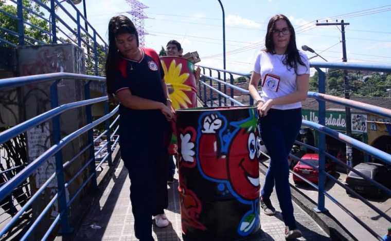 Alunos da E.E. Benedito Almeida fizeram exposição de lixeiras artesanais no T3; além da mostra, iniciativa contou, também, com palestras e coleta de lixo