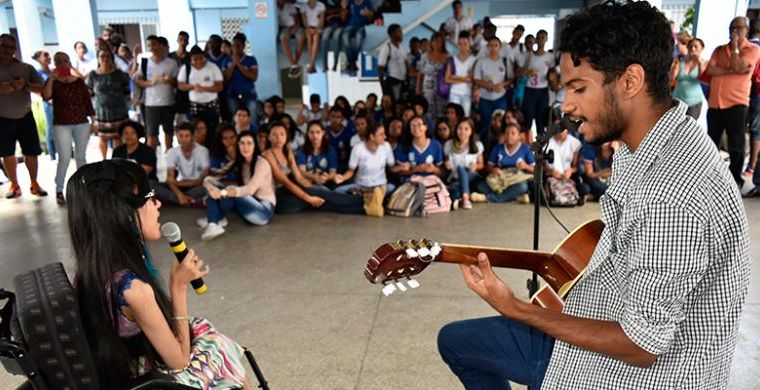 A estudante com necessidade especial, Stephany Freitas, 15 anos, 1º ano, foi uma das “artistas” do evento no Alípio Franca. “Eu amo a minha escola e adoro ser estudante. Estou muito feliz pela oportunidade de estar aqui hoje cantando para os meus colegas”, fala, sorridente. A mãe da aluna, Jane Freitas, que acompanha a filha todos os dias durante o período das aulas, conta que esta integração dela com os outros estudantes “é muito positiva para o seu processo de ensino e aprendizagem”.