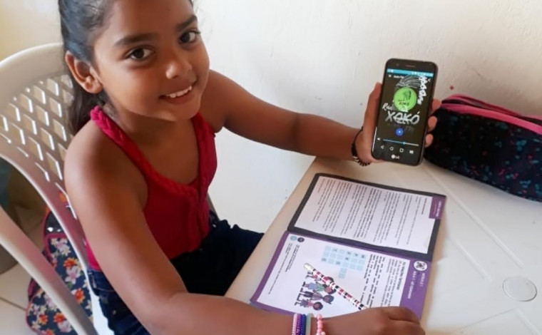 Os alunos ouvem o conteúdo e dão continuidade ao estudo por meio dos cadernos de aprendizagem, distribuídos especificamente para complementar as aulas transmitidas pelo rádio, tornando possível o acesso à educação das crianças matriculadas nos Anos Iniciais do Ensino Fundamental, e amenizando a falta física da escola e dos professores.