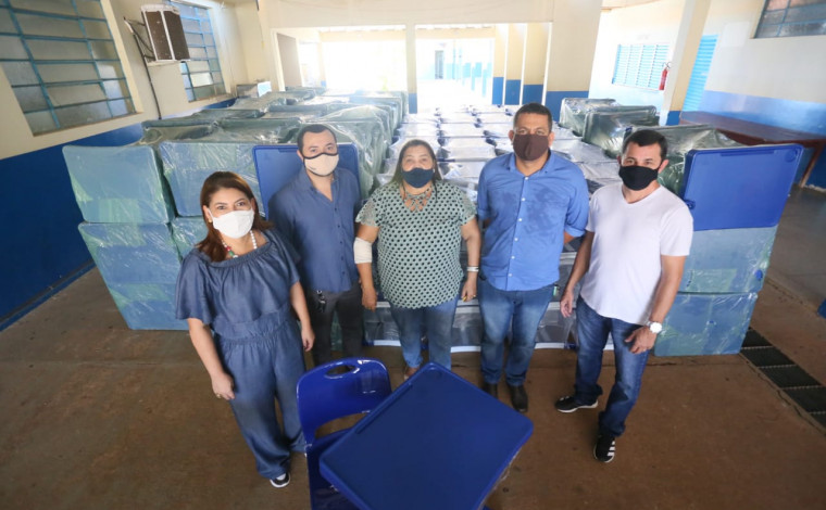 Comunidade escolar do Colégio Estadual Professora Eliacena Moura Leitão, em Novo Acordo, recebeu na manhã desta sexta-feira, 8, 280 conjuntos aluno e 8 conjuntos professor (formado por mesa e cadeiras), entregues pelo Governo do Tocantins. A entrega foi feita pela titular da Secretaria de Estado da Educação, Juventude e Esportes (Seduc), Adriana Aguiar.