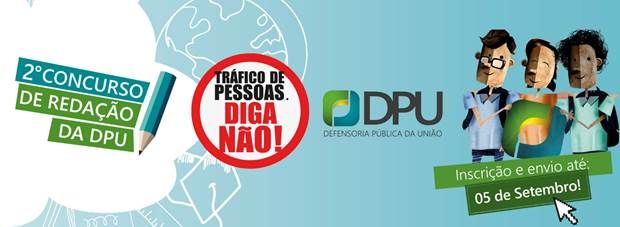 A Defensoria Pública da União lançou o Edital 80, relativo ao 2º Concurso de Redação, com o tema: “Tráfico de Pessoas - Diga não! ”, destinado à participação dos alunos das escolas públicas de todo país, estudantes do Ensino Fundamental (6º, 7º, 8ª e 9º anos) e Ensino Médio (1º, 2º e 3º anos), das modalidades EJA (Ensino de Jovens e Adultos).