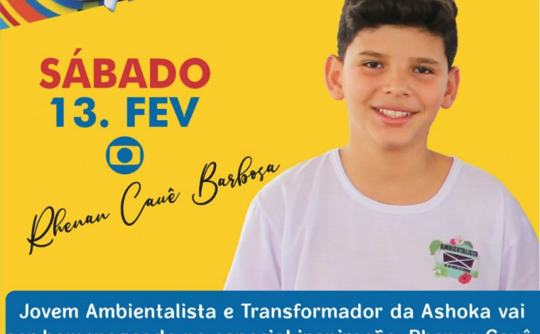 Você conhece o jovem Rhenan Cauê Barbosa Batista? Filho da professora de Ciências, Ana Cláudia da Silva, ele mora em Araguatins, estuda no Colégio Estadual Osvaldo Franco e ganhou destaque e reconhecimento nacional e internacional ao mobilizar ações de preservação ambiental. O estudante participará do quadro especial ‘Inspiração’, do Caldeirão do Huck, neste sábado, 13. O quadro traz o elenco da TV Globo para aplaudir brasileiros que têm trabalhos relevantes de transformação social.