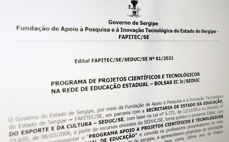 A fim de implementar o Programa Apoio a Projetos Científicos e Tecnológicos na Rede Pública Estadual de Educação, o Governo de Sergipe, por meio da Fundação de Apoio à Pesquisa e à Inovação Tecnológica do Estado de Sergipe (Fapitec) e Secretaria de Estado da Educação, do Esporte e da Cultura (Seduc), lança o edital nº 01/2021 - Bolsas IC Jr., convidando os professores pesquisadores da rede pública estadual a apresentarem propostas de orientação de alunos do ensino médio em todas as suas modalidades, bem como o último ano do Ensino Fundamental, acerca de projetos científicos e tecnológicos por áreas de conhecimento e iniciativas relacionadas à covid-19. O prazo para envio das propostas vai até o dia 9 de julho.