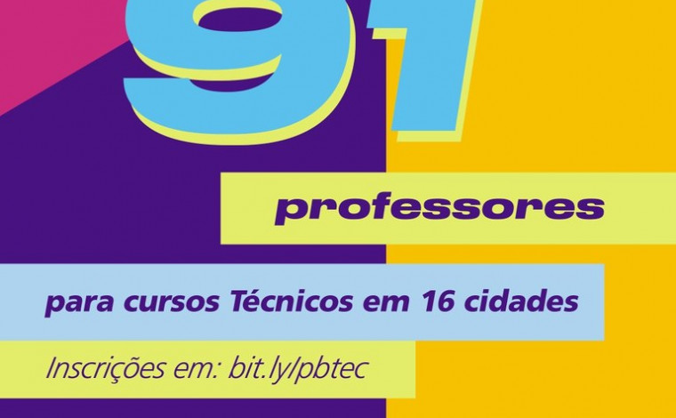 A Secretaria de Estado da Educação e da Ciência e Tecnologia, por meio da Gerência Executiva de Educação Profissional (GEEP), divulgou no Diário Oficial do Estado desta quarta-feira (14) o edital retificado de seleção com 91 vagas para Professor Bolsista do Programa Nacional de Acesso ao Ensino Técnico e Emprego (PRONATEC). As inscrições estão abertas e podem ser feitas pelo link: http://bit.ly/pbtec até sexta-feira (16). O resultado será divulgado no dia 28/04 no Diário Oficial e no site do Paraíbatec.