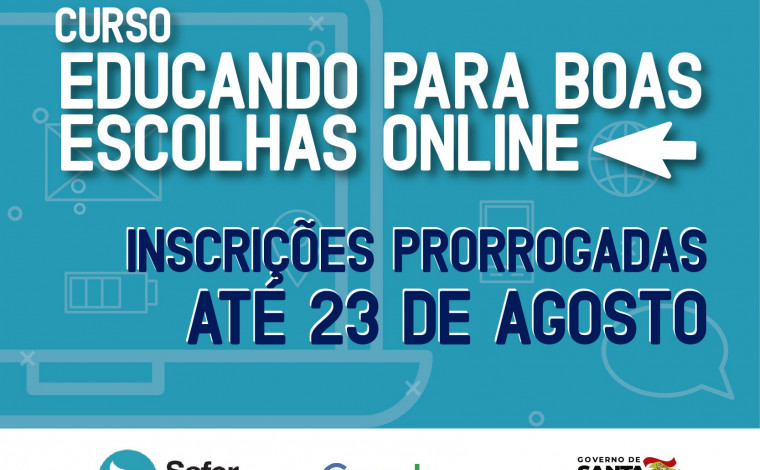 Foram prorrogadas até esta sexta-feira, 23, as inscrições para o Curso “Educando Para Boas Escolhas On-line”, oferecido pela Secretaria de Estado da Educação (SED) em parceria com o Tribunal de Justiça de Santa Catarina (TJSC). O treinamento à distância, autoinstrutivo e gratuito tem 2 mil vagas abertas para educadores da rede estadual de Ensino de Santa Catarina.
